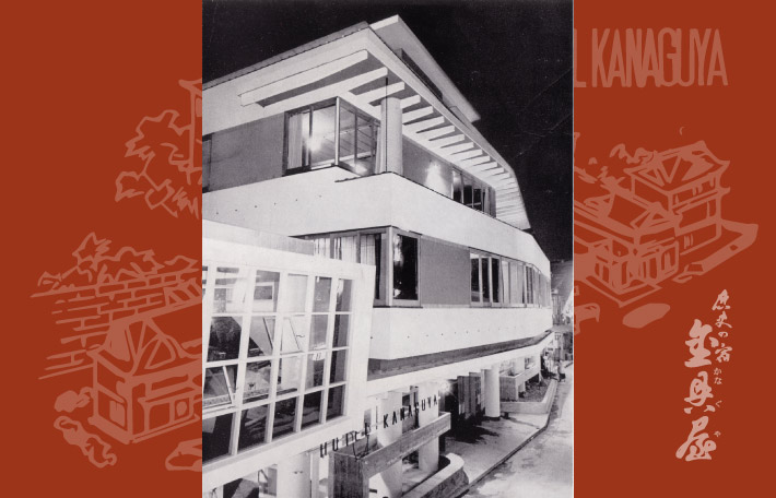 近代的な箱型のデザインにコンクリートの丸柱、白亜にはしるHOTEL KANAGUYAの文字。極めつけは左側に写っているガラス張りの部分。これは池の前につくられた中二階のラウンジなのです。玄関部分の建物自体は今と同じですから、このラウンジがあるのは木造4階建斉月楼の前、車寄せの中空ということになります。