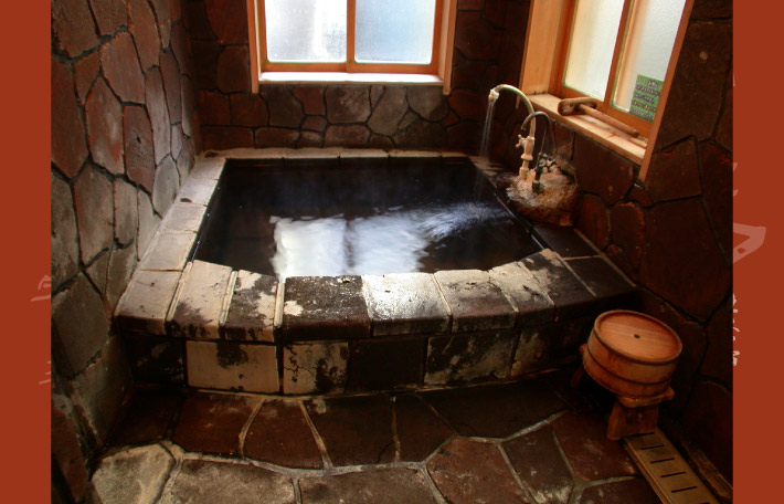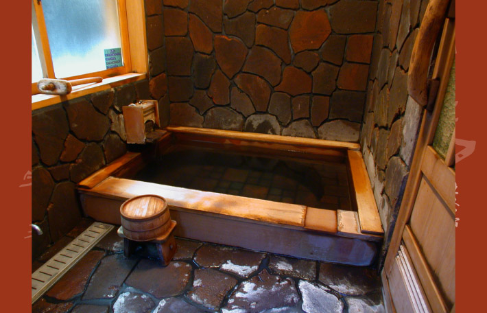 斉月楼の2階、3階、4階の階段脇にあり小さな貸切風呂群です。美妙の湯は木曽のサワラを使った樽状の浴槽。恵和の湯は浅間石、子安の湯は浅間石の浴槽に木製の湯淵のついたお風呂です。昭和30年代にタイル張りの家族風呂としてつくられました。バストイレ付客室が当たり前となった時代に、部屋に風呂のつくれない木造の建物に沿う形でモルタルの構造物を建て、それぞれの階にお風呂があるようにしたもの。当初は苦肉の策だったものが、その後の家族風呂ブームにぴったり合ったという面白い経緯があります。