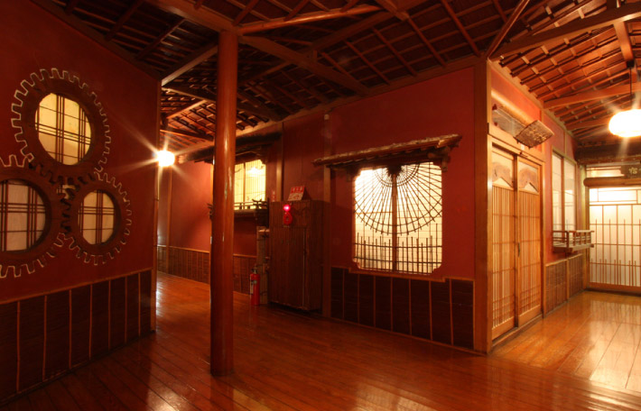 斉月楼は長さ八間半(約15m)の通し柱を13本、建物を囲うように立ち上げ、内部は四層に分かれています。東側を階段の区画にし、吹き抜けの最上階部分には富士山をあしらった窓と月を模した照明が配置されています。部屋を一軒一軒の家に見立て、廊下を外に見立てており、それぞれの部屋でそぞれぞれの廊下ですべて違う造りとなっているのも特徴です。水車の部材を使用したデザインなども当時のもので、伝統的なやり方よりも極端な遊び心があらゆるところで見られます。材料は主に杉、松、ケヤキといった地元の木材を使用。内装はべんがら塗という、信州ではあまり例のない真っ赤な壁も特徴です。