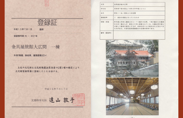 金具屋大広間は文部科学省の登録有形文化財に認定されています。
