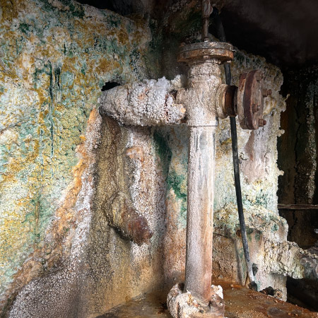 湧出温度は約80℃。そのままでも地上に湧出するのですが、現在はコンプレッサーで空気を送り込んで汲み上げています。毎分約25リットル。金具屋の源泉では唯一の動力揚湯式の源泉です。