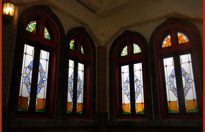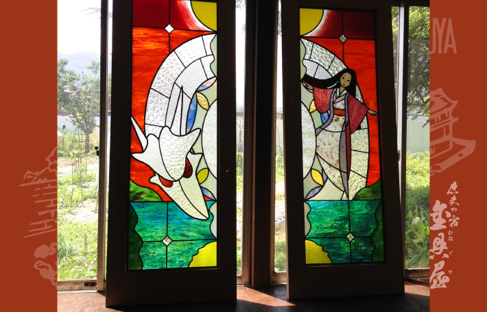 ローマの噴水をモチーフにした浴槽と、ステンドグラスの入ったアーチ窓が特徴の浪漫風呂。昭和25年に金具屋初の西洋風浴堂「ローマ風呂」として完成したものです。大正時代から昭和初期に全国各地でこのようなタイル張りのローマ風風呂が造られましたが、噴水を浴槽にした例はあまりありません。2013年にステンドグラスを刷新。ヨーロッパでつくられたガラスを使用した本式のステンドグラスとなりました。入り口はこの町に伝わる民話、大沼池の黒龍をモチーフにしています。