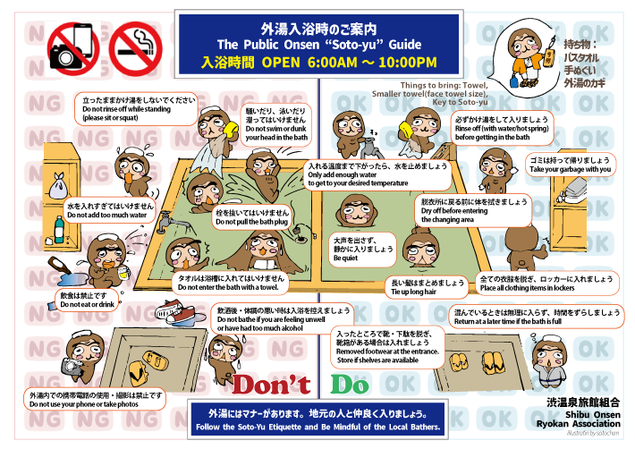渋温泉旅館組合で制作した、渋温泉の外湯のご利用についてのイラストです。あまりルールばかり気にしては楽しめませんが、このようなことをご留意いただければと思います。どうぞよろしくお願いいたします。